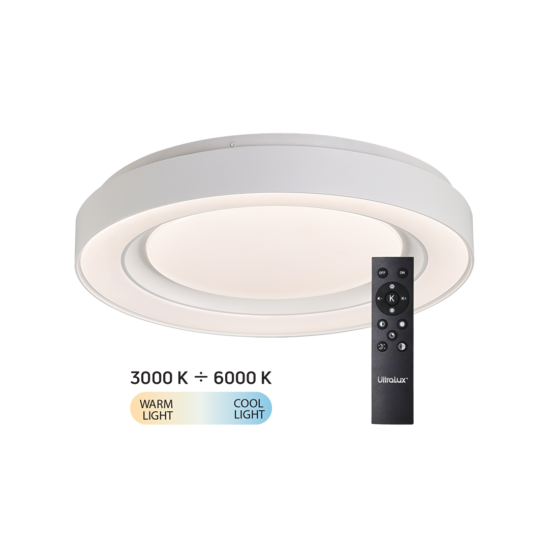Кръгла LED плафониера в бял цвят с модерен дизайн, подходяща за всекидневна, спалня или офис. Максималната мощност е 72W, като осигурява светлинен поток до 7200 lm. Цветната температура се регулира в диапазон 3000K – 6000K (от топла до студена светлина), а осветлението е димируемо за настройка на яркостта според нуждите. Индексът на цветопредаване (CRI) е ≥80, а светлоразпределението е 120°. Използвани са светодиоди тип SMD2835.