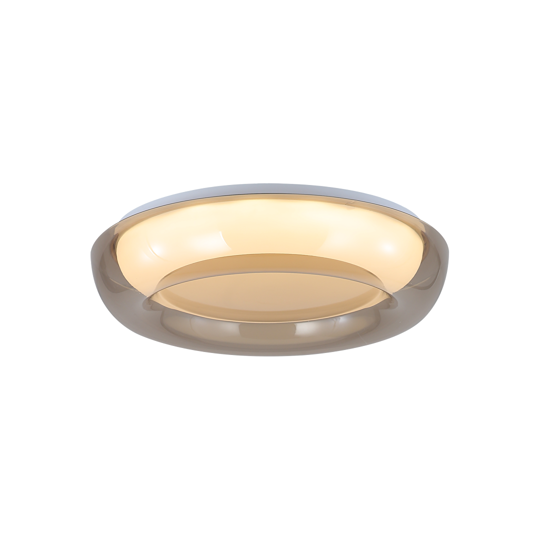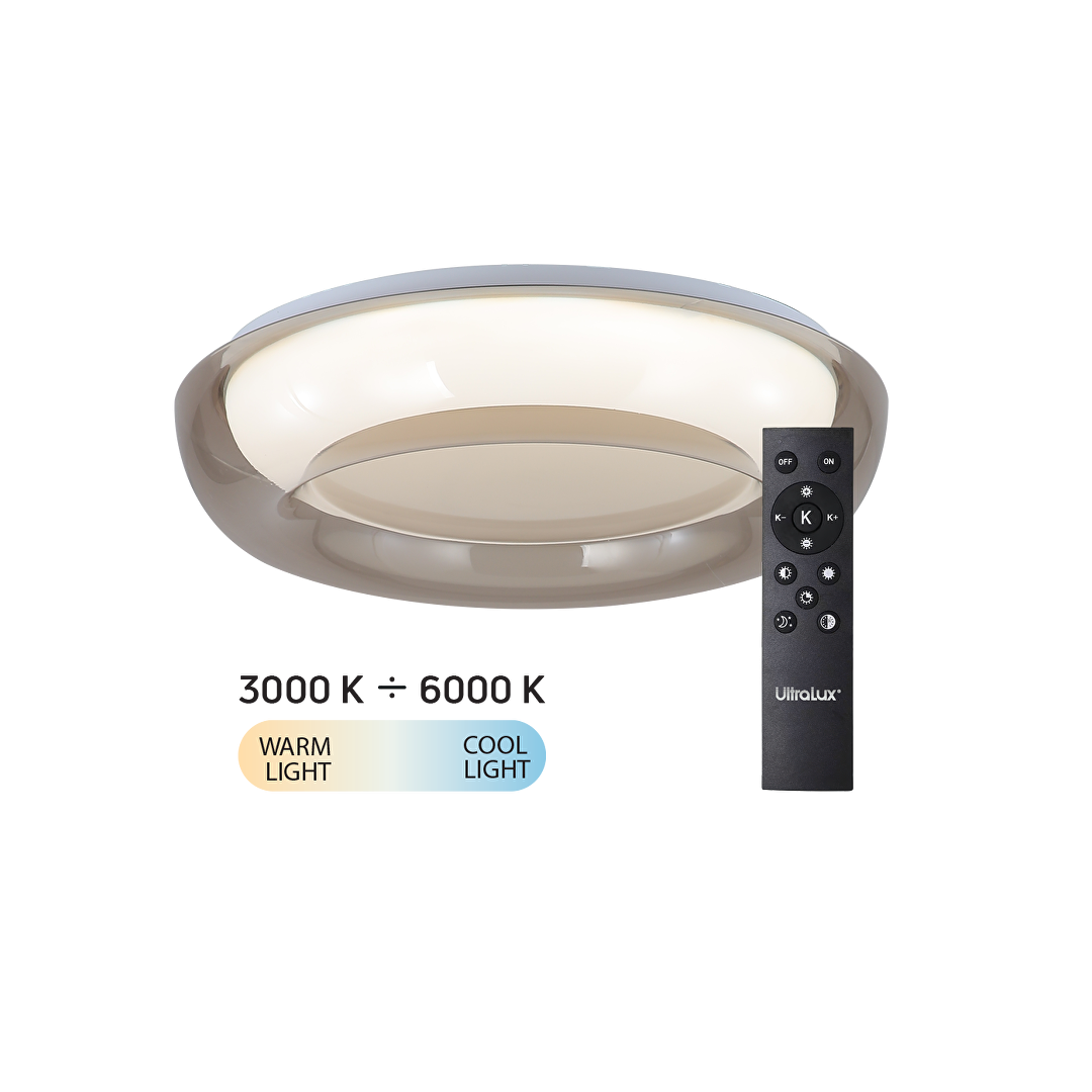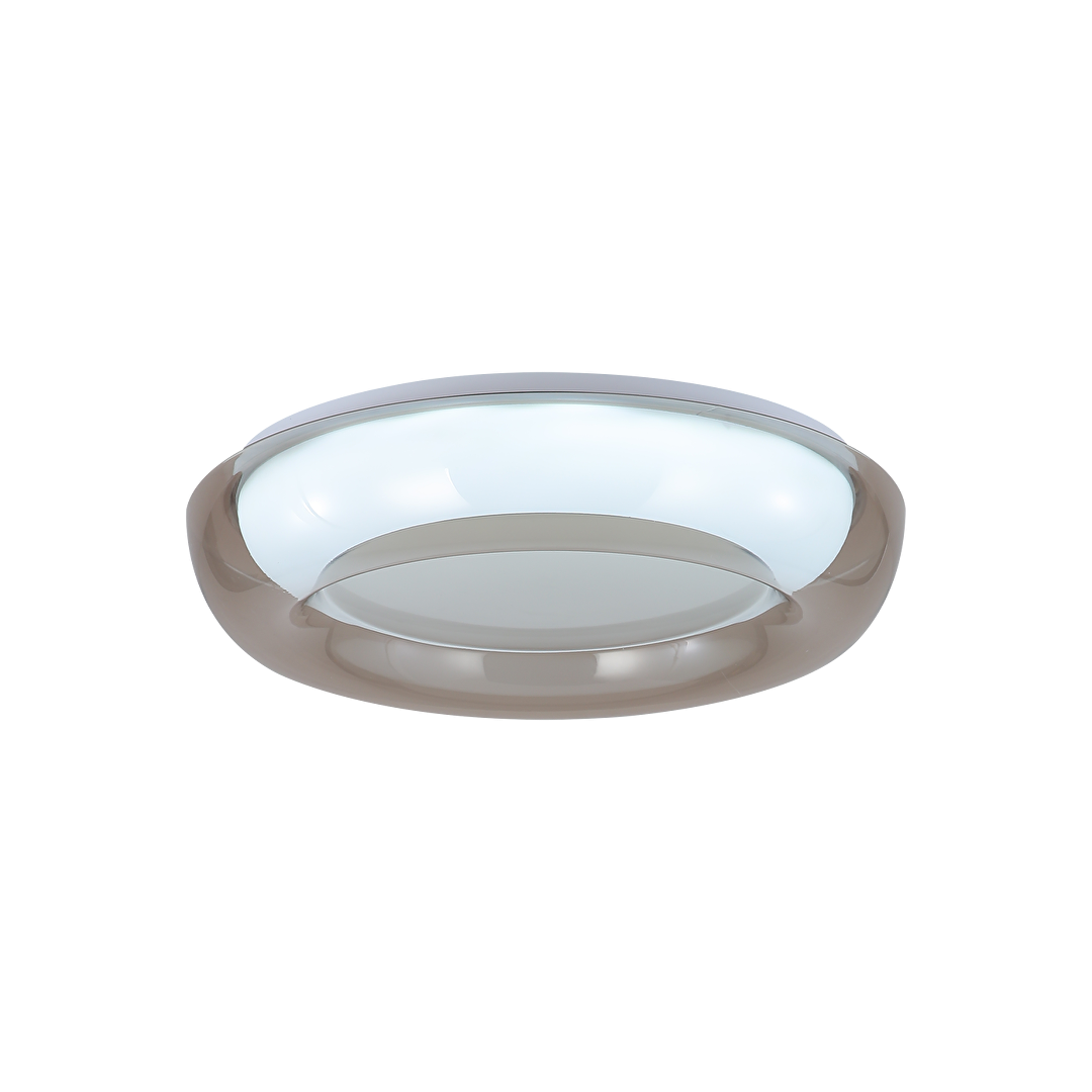 Кръгла LED плафониера в цвят опушен кварц с елегантен и модерен дизайн, подходяща за всекидневна, спалня или трапезария. Максималната мощност е 72W, като осигурява светлинен поток до 7200 lm. Цветната температура се регулира в диапазон от 3000K до 6000K (от топла до студена светлина), а осветлението е димируемо за пълен контрол на яркостта. Индексът на цветопредаване (CRI) е ≥80, а светлоразпределението е 120°. Използвани са светодиоди тип SMD2835.