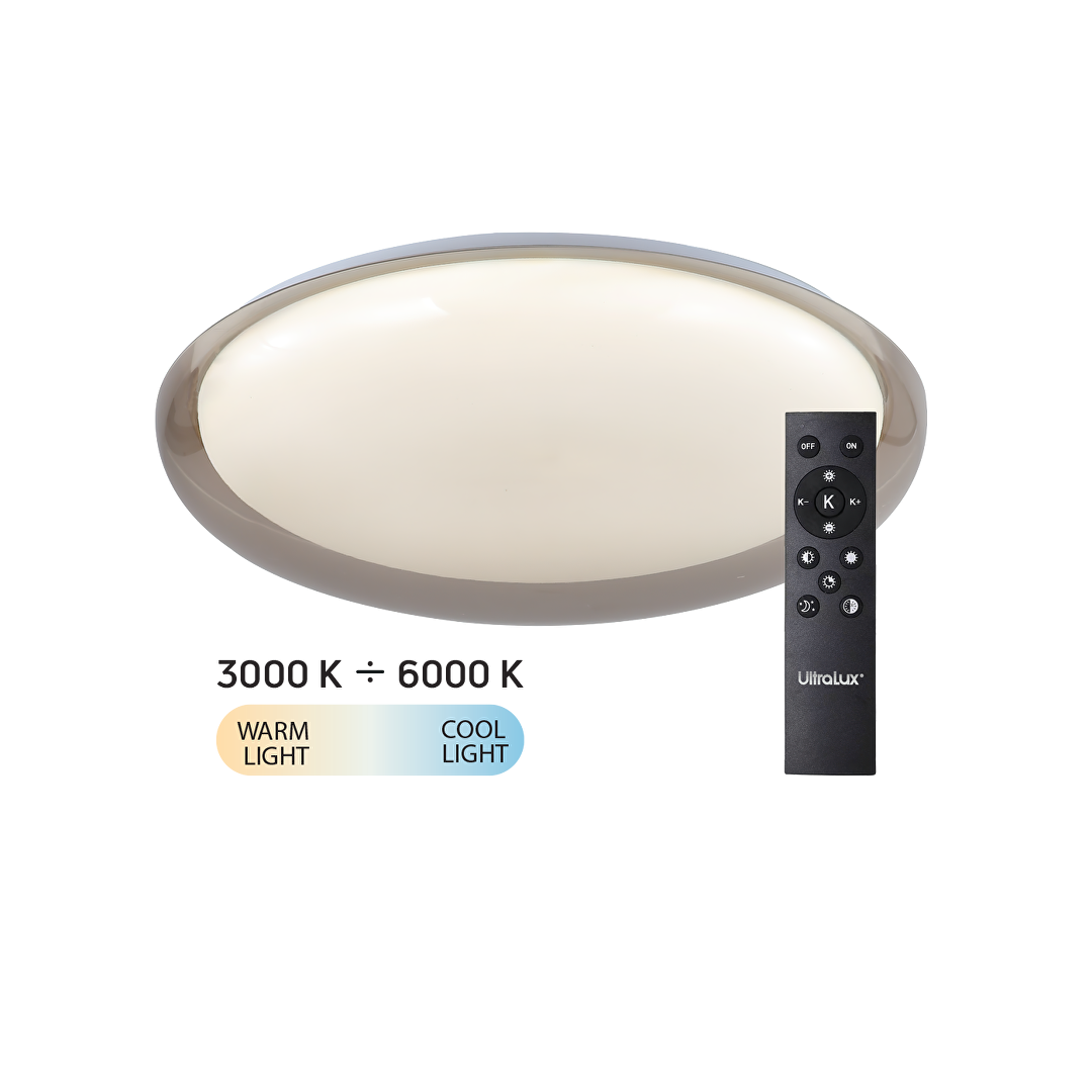 Кръгла LED плафониера в цвят опушен кварц, подходяща за модерни интериори. Максималната мощност е 72W със светлинен поток до 7200 lm. Цветната температура се регулира от 3000K до 6000K (топла, неутрална и студена светлина), а осветлението е димируемо. Индексът на цветопредаване (CRI) е ≥80, със светлоразпределение 120° и светодиоди тип SMD2835.