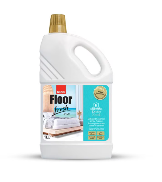 Сано Фреш "Екзотик Хотел" - Препарат, подходящ за всички видове подове: керамика, гранит, порцелан, мрамор и др.Обогатен със специални аромати с дълготраен освежаващ ефект. 4 в 1: почиства, полира, защитава всички видове подове.