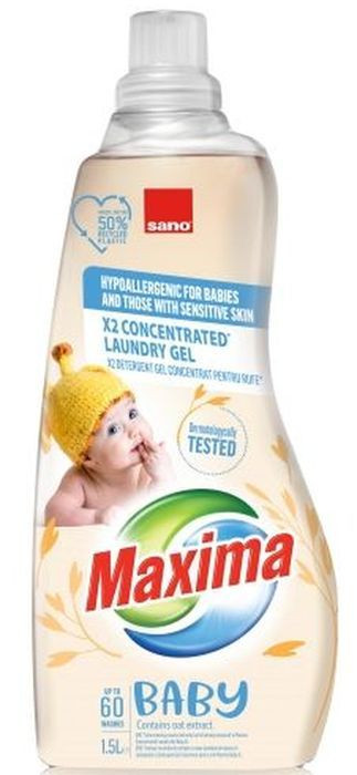 Сано Максима "Бейби" е концентриран гел за пране. Гелът почиства и премахва петна лесно и ефективно, като същевременно предпазва нежната бебешка кожа. Сано Максима "Бейби" е хипоалергенен, дерматологично тестван, подходящ за чувствителна кожа, с деликатен аромат, обогатен с екстракт от овес.