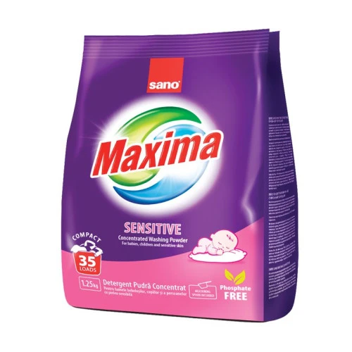 Сано Максима Био съдържа голямо количество ензими с оглед на по-ефикасното отстраняване на петна от яйца, кръв, шоколад, сос, кетчуп, мазнини и всякакви видове петна от храна. Този перилен препарат е подходящ за всички видове перални машини и всички температури, за пране на памук, спално бельо и синтетични материи. Препаратът съдържа специални добавки с оглед на предотвратяване на натрупвания по вътрешността на пералната машина и предпазването и от корозия