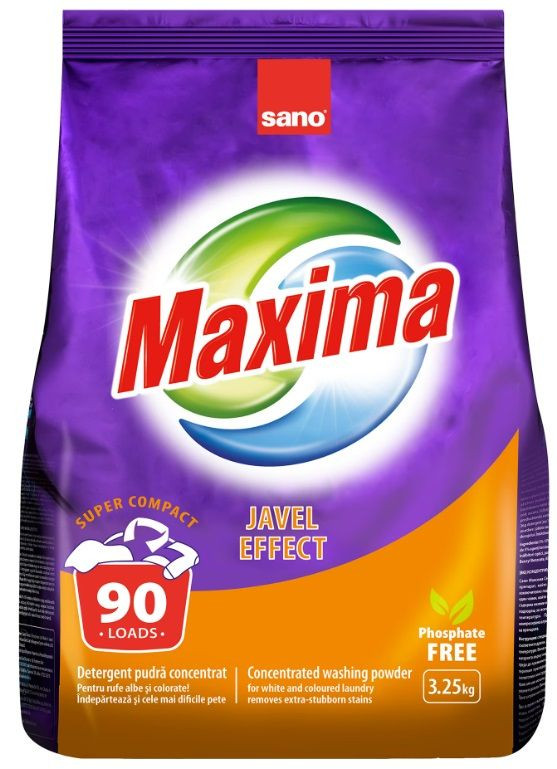 Сано Максима Ефект Жавел е прах за пране, който е подходящ за всички видове перални машини и всякакви температури. Препаратът е идеално почистващо средство за памук, спално бельо и изкуствени материи. Максима Ефект Жавел ефективно отстранява упоритите петна и освежава цветните материи. Прането остава хигиенично чисто с деликатен и приятен аромат.