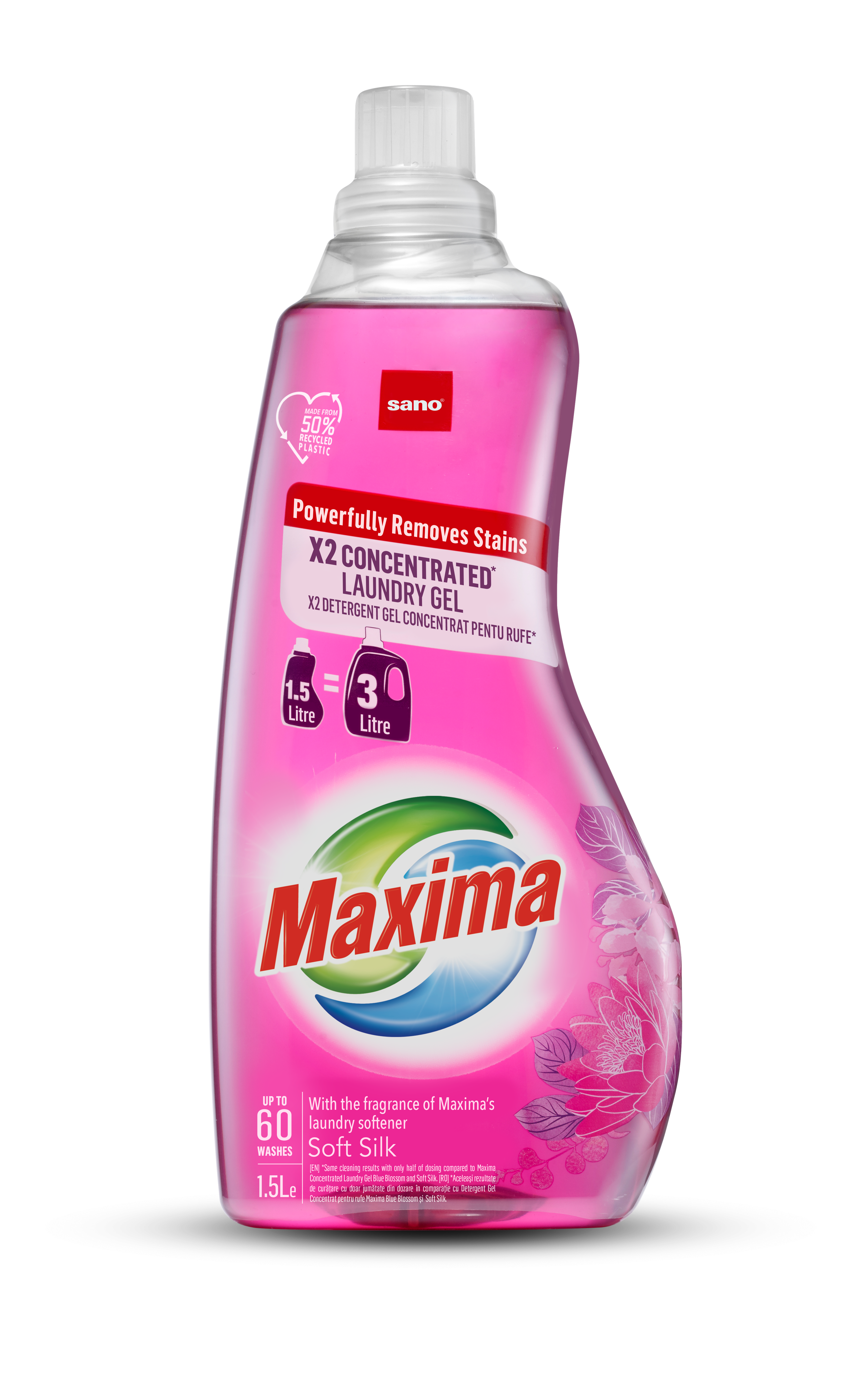 Сано - Максима "Софт Силк" - концентрираният гел за пране е уникална комбинация от ензими и перилни препарати за мощно отстраняване на петна, почистващи ефективно при всякаква температура на водата.