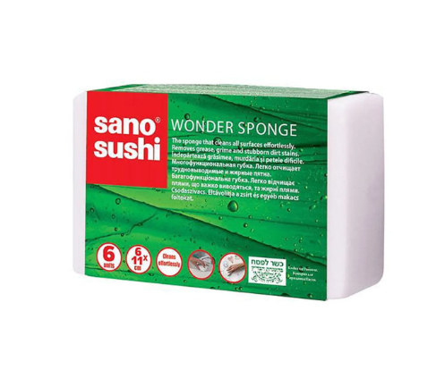 Сано "Лондър Спондж" - е гъба, произведена по най-съвременни технологии и почиства всякакъв вид замърсявания без необходимост от препарати.Подходяща е за почистване на санитарни помещения, килими, различни видове текстилни повърхности, мебели, коли, мрамор и др. Премахва дори най-упоритите мазни петна! Най-големия плюс освен, че не изисква употребата на препарати е, че при продължителна употреба не се разпада, а просто се разтапя, докато не изчезне напълно.