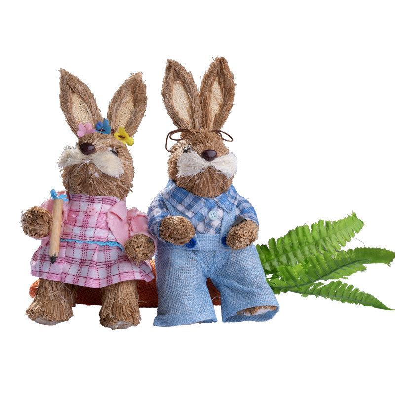Очарователна великденска декорация, двойка зайчета – момиче и момче, седнали върху декоративен морков. Фигурките са изработени от естествени декоративни влакна и текстил, в автентичен рустикален стил и топло, пролетно излъчване.
